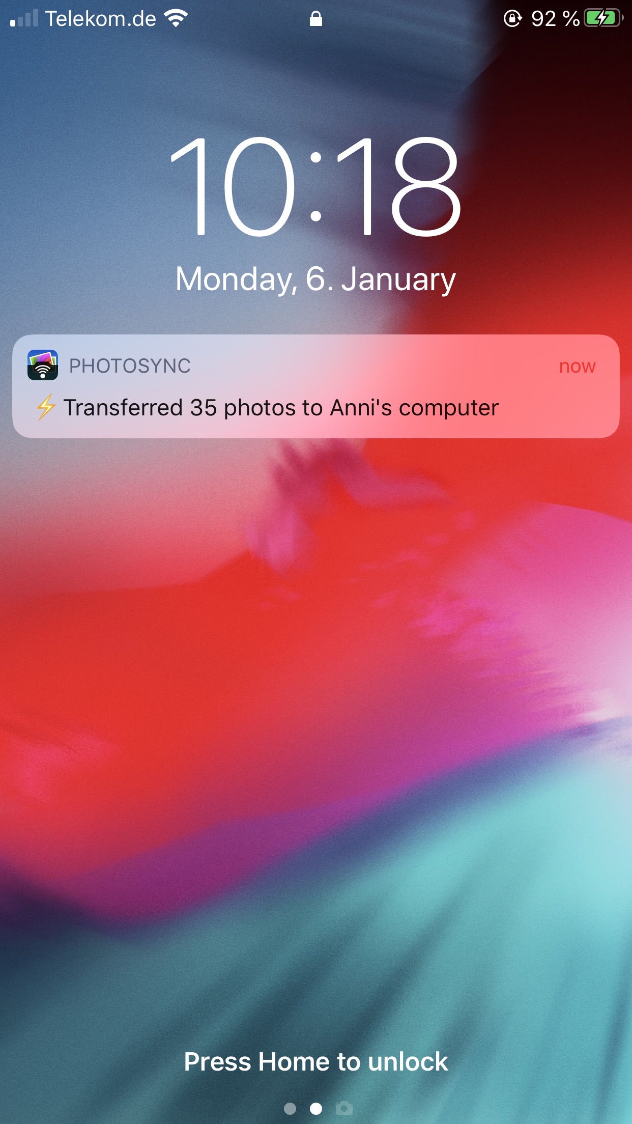 Sobald die Autoübertragung ausgelöst wurde, setzt PhotoSync den Zeitpunkt für die nächste Autoübertragung auf den vereinbarten Zeitpunkt am nächsten Tag. Über das Benachrichtigungssystem Ihres Gerätes erhalten Sie bei einer erfolgten Autoübertragung eine Benachrichtung, ebenso bei einem aufgetretenen Fehler.