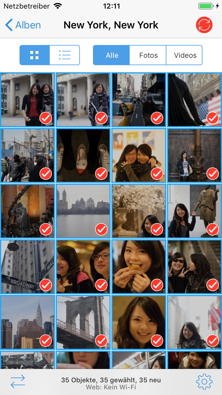 Tippen Sie auf die rote Übertragungsschaltfläche und wählen Sie Ihre gewünschte Aktion aus: Neue, Selektierte oder Alle..