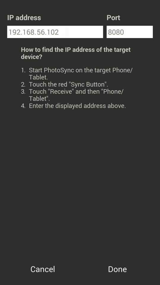 To get the IP address and port of your target device, please press the red transfer button on the target device, select the Receive section and tap on the Phone/Tablet symbol. In this example, the IP address of the target device is 192.168.56.102 and the port is 8080. With your own devices, the IP address will be very likely different.